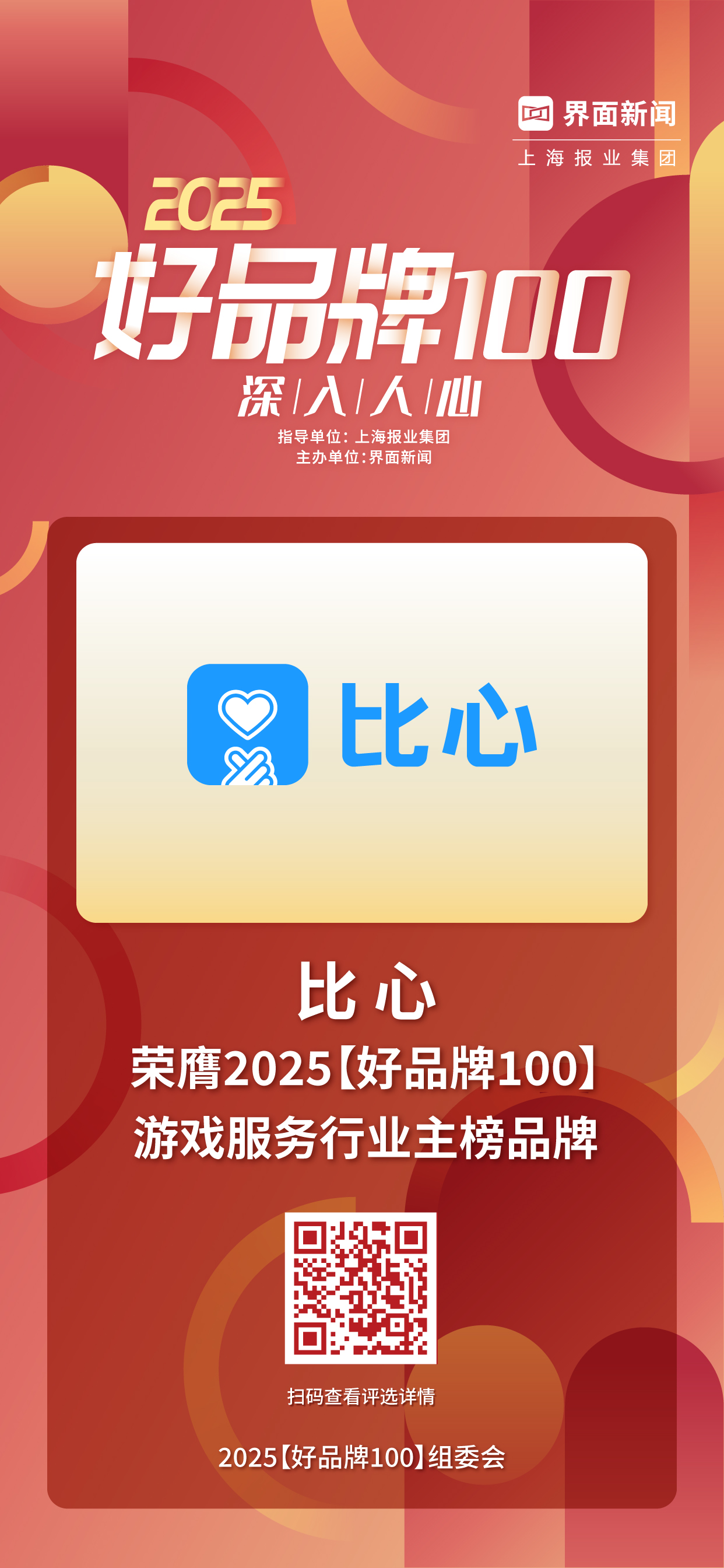 其中,比心荣膺2025【好品牌100】游戏服务行业主榜品牌。